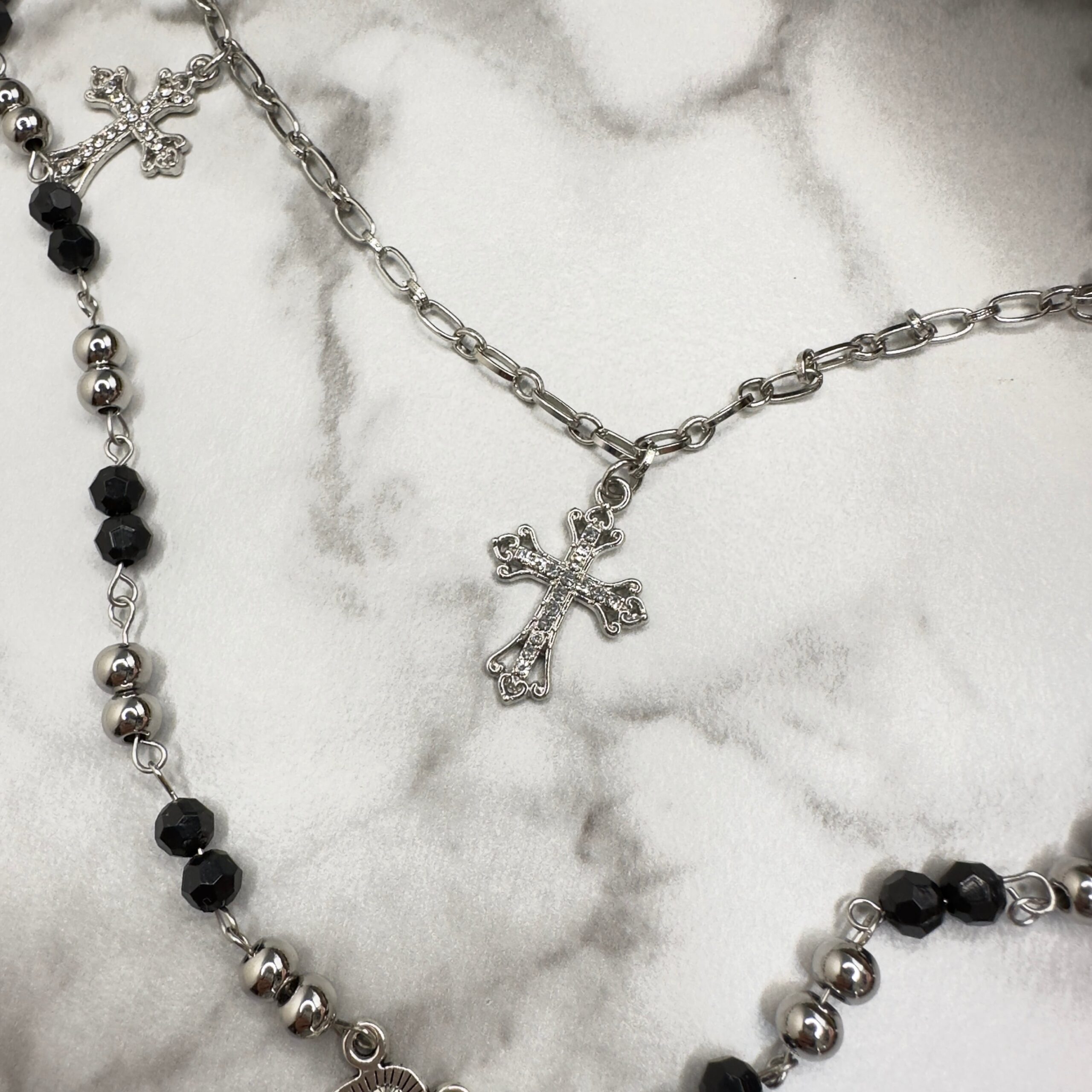 ビーズや十字架が織り成すデザインは、どこかミステリアスでありながらもエレガント。このネックレスを身につければ、一歩先のスタイリッシュな装いが叶います。